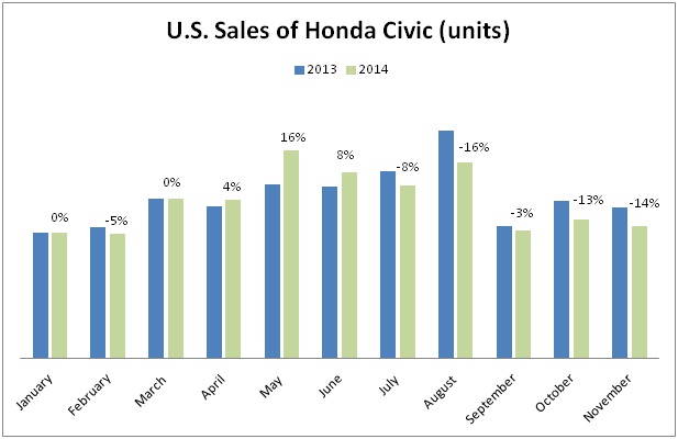 Civic has had a lackluster year in 2014, and ever since oil prices started weakening in June, its fortunes have taken a bad turn. The 2015 model launched in September has failed to ignite sales so far. Analysts expect car sales in December to be strong, but whether it will show in Civic's numbers, we won't know until next month.