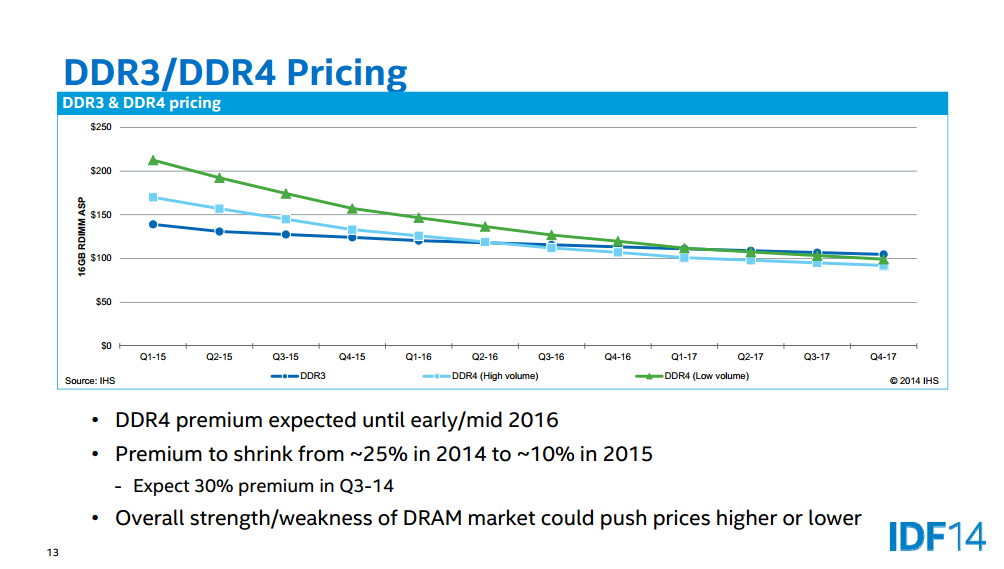 The premium of DDR4 to DDR3 is, as shown in the slide, expected to be 25% in 2014, and that premium will come down to about 10% in 2015. While 10% might not seem like much (and it could be lost within a multi-hundred dollar system), this is an extra cost that will lead to one of the following outcomes for 2015 PCs: