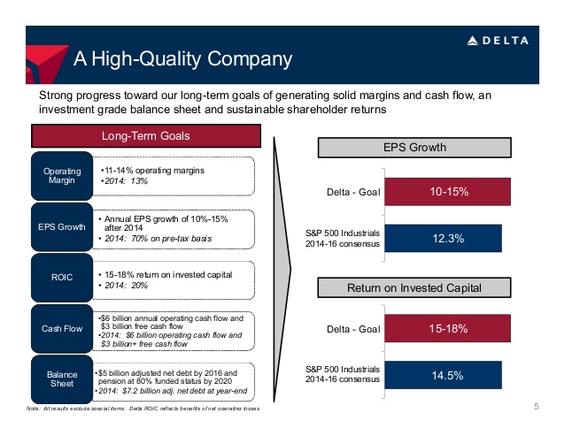 Delta Airlines is a mature business with solid profitability and enticing growth prospects. It has a relatively young fleet, and shows increasing ancillary revenue -- the non-ticketing revenue that often brings the highest margin to an airline's bottom line. From the slide shown at the outset of this article it's clear that Delta has restructured its business quite efficiently post-bankruptcy, setting immediate goals to outpace S&P industrial companies in earnings per share, or EPS, and return on invested capital, or ROIC.