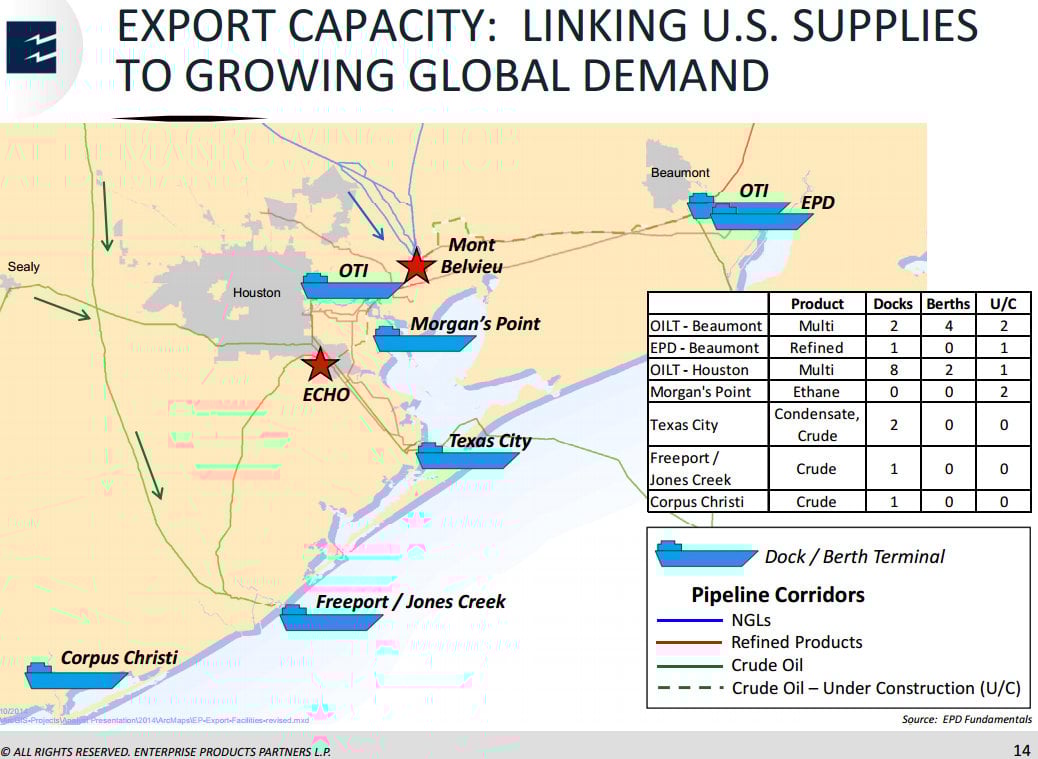 However, the other big story, and the one few notice, is how Enterprise Products Partners is strategically preparing itself for crude oil exports. The company is focused on adding capacity to export refined petroleum products such as gasoline and diesel. However, it has taken steps toward oil exports: Earlier this year, it was given permission to export a minimally refined ultra-light oil known as condensate. As a first mover in exporting this product, the company positioned itself to move into exporting unrefined crude oil when the United States ends its oil export ban on other varieties of crude oil.
