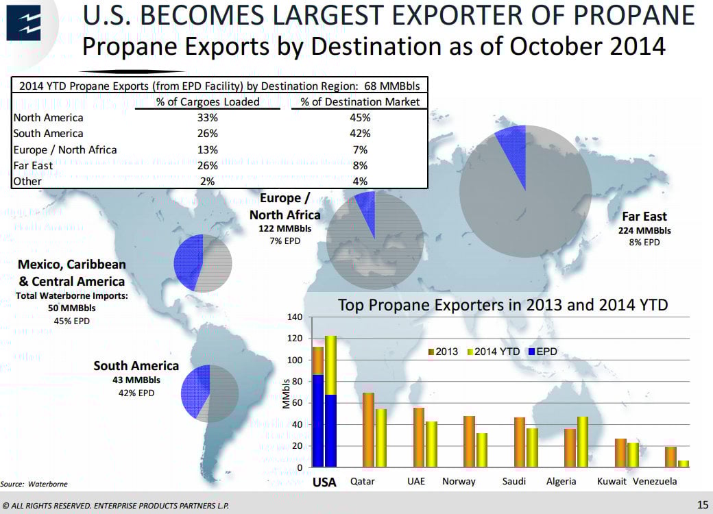 Enterprise Products Partners saw this trend coming early on and has quietly built the energy export infrastructure so that it could profit from shipments of such materials abroad. Because of this, the company nearly single-handedly turned North America into the world's leading exporter of propane, as shown in the following chart.