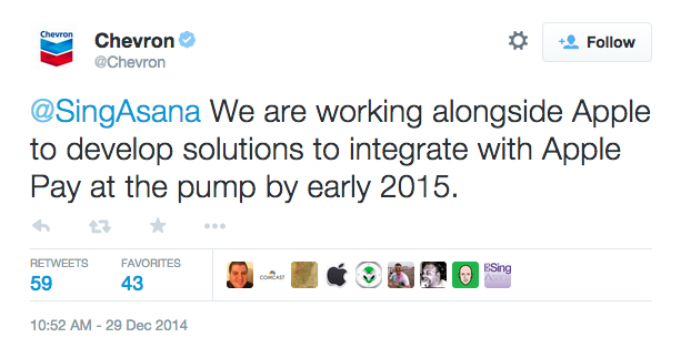 It's also important to contextualize the relatively limited number of vendor partners that support Apple Pay. Only available for iPhone 6 and 6 Plus users in the U.S., Apple only lists 31 partner banks and 43 brands that support the service, and even some of those might overstate Apple Pay's actual present level of support. For example, Apple lists Chevron as a current partner. However, a recent tweet from Chevron's official Twitter account suggests it won't broadly support Apple Pay until early 2015.