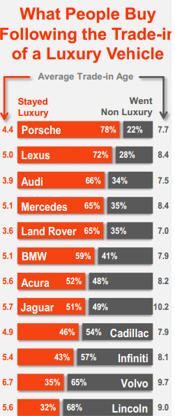 The graphic on the left, from the hardworking crew at Edmunds.com, shows what people buy after returning their luxury ride. First, the Porsche statistic should probably be ignored: If a consumer has purchased a Porsche, chances are their days of driving a non-luxury or mass-market car are over.