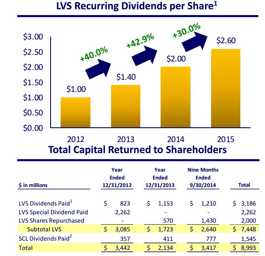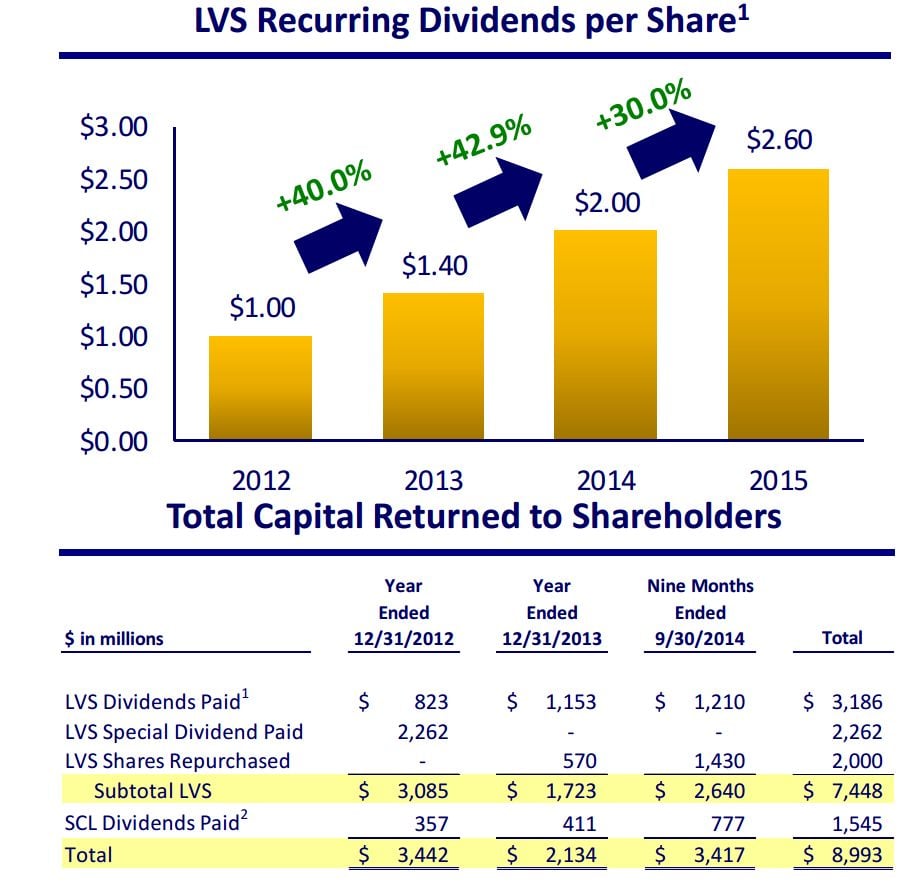 Las Vegas Sands is actively distributing capital to investors via both dividends and stock buybacks. The company announced a 30% dividend increase for 2015, on the back of a 42.9% payout hike for 2014. During the third quarter, Las Vegas Sands completed a $2 billion stock buyback program that started in June 2013, and management has received board authorization for an additional $2 billion in repurchases.
