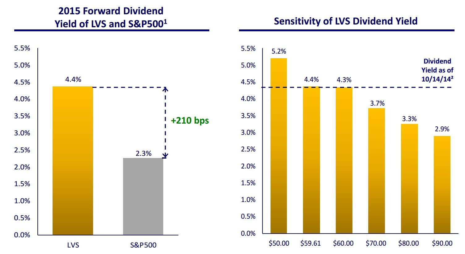 Also, dividends should provide some downside protection. At current prices, Las Vegas Sands' dividend yields 4.4%; this is versus a 2.3% average dividend yield for companies in the S&P 500, and it provides cash payments for investors while they wait for capital appreciation over the long term.
