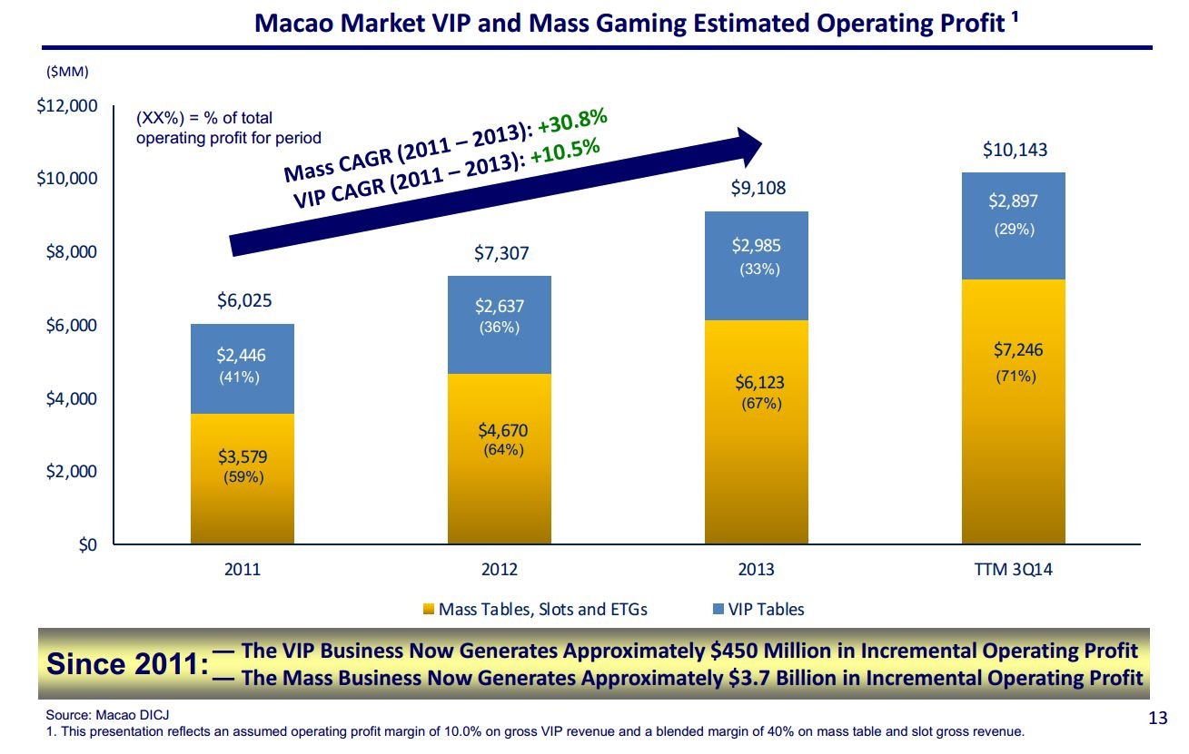 Las Vegas Sands makes more than 80% of its operating profit from the mass gaming market, both in Macau and in Singapore. This is a particularly profitable segment with gargantuan room to benefit from the rise of the Chinese middle class in the years ahead.