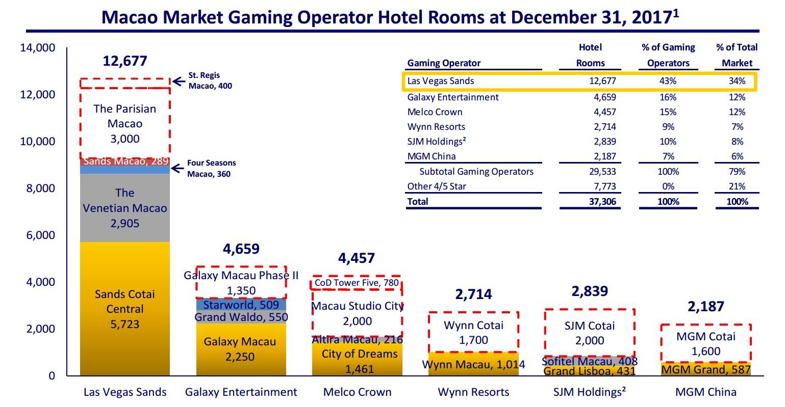 Las Vegas Sands plans to have more than 12,600 rooms in Macau by 2017, representing a dominant 43% market share among gaming operators.