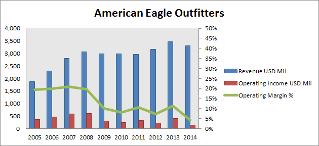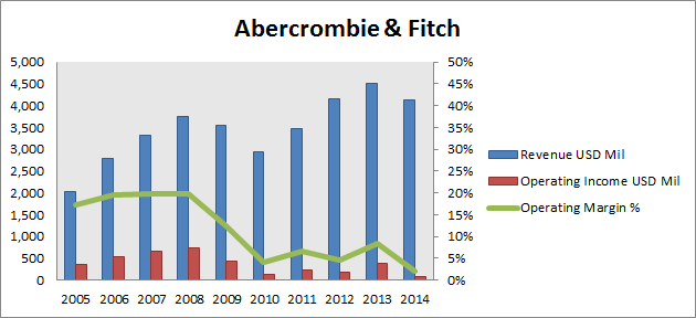 It looks like American Eagle and Abercrombie are headed for bad times. Both retailers prospered in the years leading up to the Great Recession; rising revenue unlocked large increases in profitability that was enabled by operating leverage. However, both are now struggling to maintain revenue, leading to a sharp downtick in operating earnings.