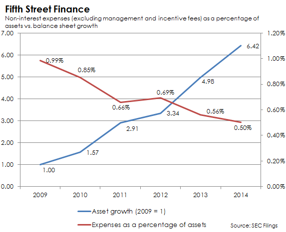 Medley Capital is roughly as efficient as Fifth Street Finance was at its size, and they are fairly comparable, as neither company had any significant one-time expenses, such as mergers or acquisitions of rivals, during their histories.