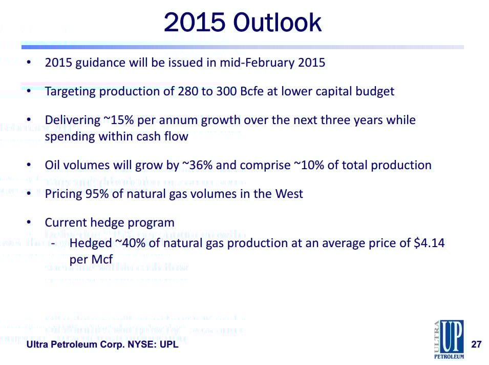 This is a bit of a surprise, as less than 10% of Ultra's current production is oil. Investors need to keep this in mind when considering what 2015 might hold for the company.