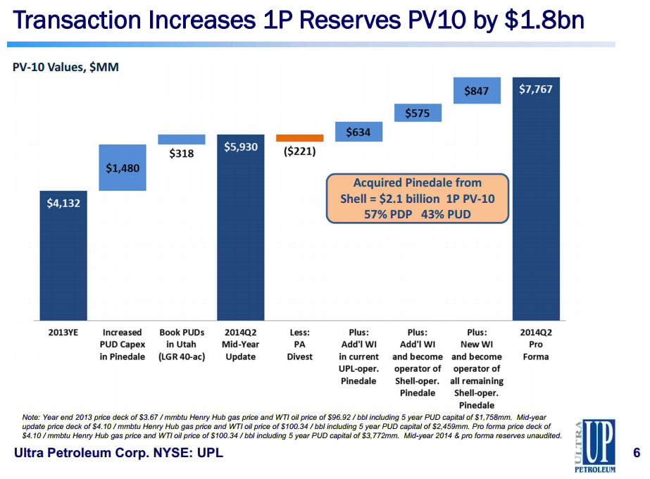 Last year was transformational for the company's natural gas business: Ultra divested lower-returning acreage in the Marcellus shale and acquired acreage in its core Pinedale play in a big trade with Royal Dutch Shell (NYSE: RDS-A) (NYSE: RDS-B). The following chart shows that deal added $1.8 billion in value to the company just through the proved reserves it acquired.
