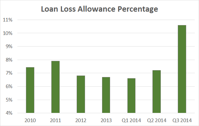 This practice caught up with Conn's in 2014, and the company took a big charge in the third quarter to bring this percentage up to 10.6%, wiping out most of the operating profit. Given how much the credit portfolio has deteriorated, this may not even be high enough.