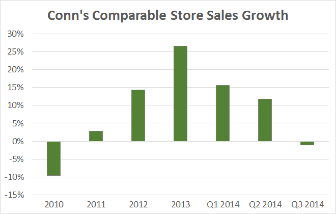 Everything fell apart for Conn's in 2014. The stock cratered, falling 75%, as comparable-store sales growth slowed and margins collapsed. In the third quarter, comparable-store sales actually declined by 1%, a stark shift from the 26.5% growth in 2013, and a huge charge related to Conn's credit business wiped out nearly all of the company's operating profit.