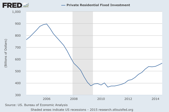 Meanwhile, there's still plenty of room for growth in the market for home improvement spending. Sure, the housing market could turn in another soft year in 2015. But private residential fixed investment (spending on homes) as a percent of GDP was just 3.2% in the third quarter, which is well below the long-term average of nearly 5%.