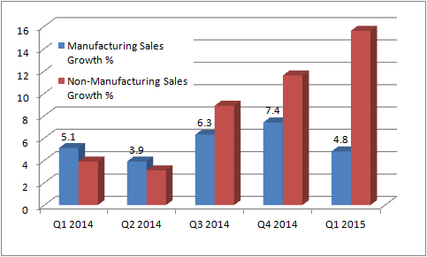 As regular readers already know, the industrial equipment wholesalers are a good barometer of the industrial economy. Unfortunately, the latest set of manufacturing sales figures from MSC indicate a slowing of growth in its first quarter. Interestingly, its nonmanufacturing sales growth is accelerating strongly. For reference, the company generated 70% of its sales from manufacturing customers in the first quarter.