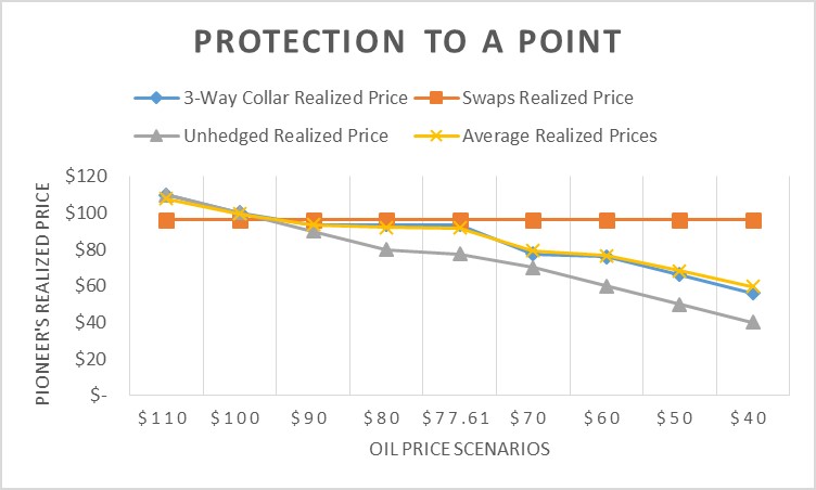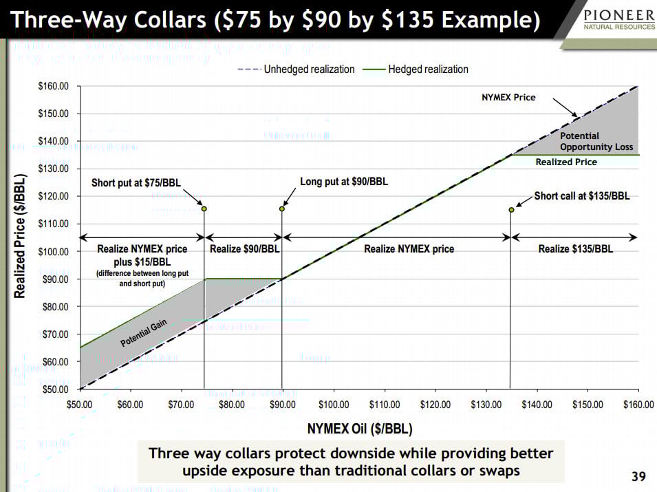 The example below from a Pioneer Natural Resources investor presentation shows that as long as the price of oil remained above $75 per barrel, the company would realize $90 per barrel while having upside all of the way to $135 per barrel should the price of oil rise.