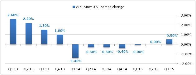 Wal-Mart U.S. comps growth in the past 11 quarters. Chart data source: Wal-Mart Quarterly Releases.