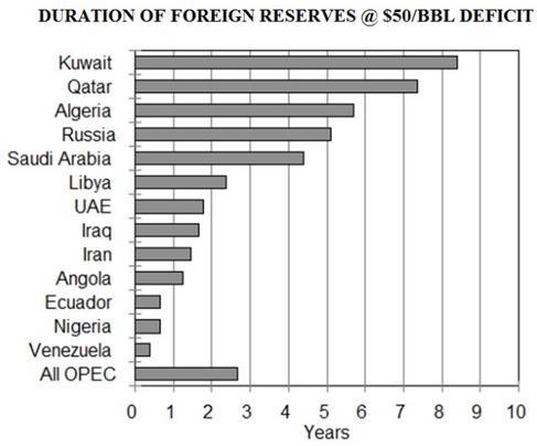 A production cut would certainly be appreciated by countries such as Ecuador, Nigeria, Iran, and Venezuela, who are running budget deficits at $50 per barrel of 4%, 12%, 13%, and 15% of GDP, respectively, and whose foreign currency reserves can't withstand 18 months of oil at current prices.