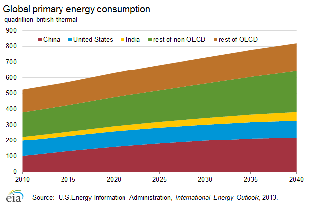 China has a major energy problem on its hands. While developed nations around the world focus on reducing the amount of energy they consume, an industrializing China is on track to consume ever more energy. The reason is economic development, a trend that isn't expected to stop any time soon, even if the pace of the country's growth begins to slow. The U.S. Energy Information Administration (EIA), for example, projects that China's energy demand will continue to grow from now until 2040, at which point it will dwarf the demand seen in the United States.
