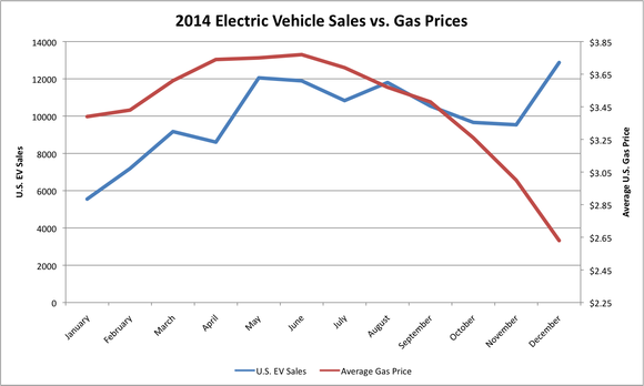 Incredibly, as gas prices fell, EV sales were constant to slightly higher, highlighted by record December sales of 12,874 units. Below, you can see how overall sales trended during 2014 versus gas prices. The correlation you might expect, of sales dropping as gas prices drop, hasn't come to fruition yet.