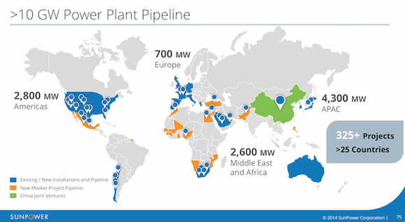 SunPower is also diversified across all markets. It competes with SolarCity (SCTY +0.00%) and Vivint Solar (VSLR +0.00%) in the residential space, and is building the largest solar plant in the world, a 579 MW project being sold to Warren Buffett's MidAmerican Energy. The company is also diversified around the globe. You can see below that management has a 10 GW power plant pipeline building across diverse locations.