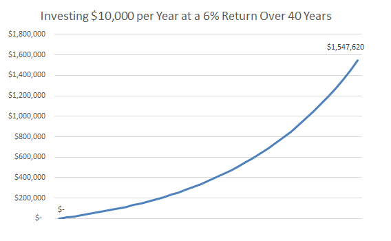 A 25-year old who earns $50,000 per year and invests 20% their salary would have $1.55 million at age 65, assuming a reasonable 6% rate of return. That's 31 times their salary at retirement, an incredible sum of money.