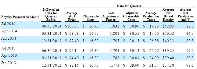 As this chart shows, in July of 2014 BP's production cost was just $16.9/barrel, yet it was able to deduct $30.96/barrel from the trust's royalty per barrel thanks to the cost-adjustment factor.