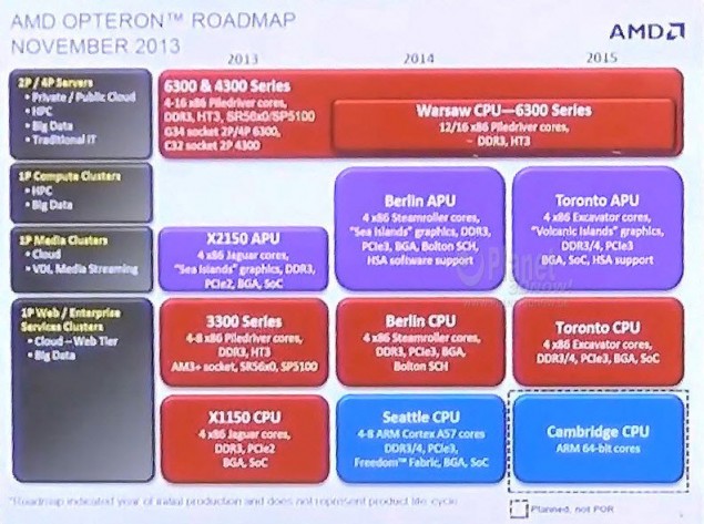 While there has much fanfare around its ARM efforts, AMD has made clear it plans to continue competing in the X86 server chip market. Planet 3DNow! (via WCCFTech) has posted the following AMD server road map, which is current through November 2013: