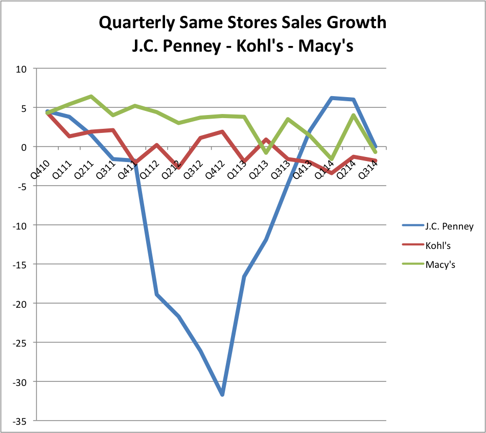 It's worth noting that as Kohl's and Macy's were stumbling, J.C.Penney was on the march toward improvement, and its fourth-quarter comps last year came in 2% higher than in the prior year. Of course, considering the absolutely horrendous year the department store chain had in 2012, any sales growth would be a welcome sign, but J.C. Penney has continued to outperform its rivals as its condition stabilized.