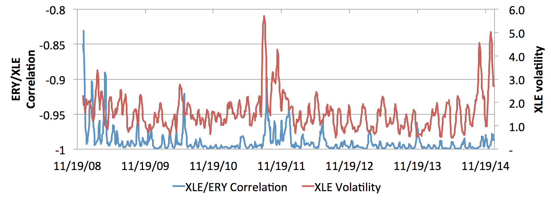Since it launched over six years ago, Energy Bear lost value in 99% of rolling one-year periods. As we've seen, it deteriorates fastest in times of high volatility, and volatility hasn't been this high in the energy sector since 2011.
