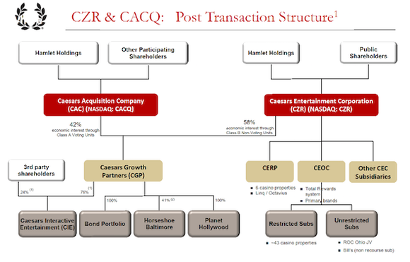 Good assets in Las Vegas, like Planet Hollywood, The Cromwell, The LINQ, Bally's Las Vegas, as well as online gaming assets were sold to Caesars Growth Partners. Part ownership in Caesars Growth Partners was then sold to the public in the form of Caesars Acquisition Company (NASDAQ: CACQ). In the process, private equity owners TPG and Apollo acquired proportional shares in the new company, hoping that even if the bad assets of Caesars Entertainment Company went bankrupt the good assets of Caesars Acquisition Company would leave them with some value. Below is an old, but still valuable org chart Caesars presented before Caesars Acquisition Company went public.