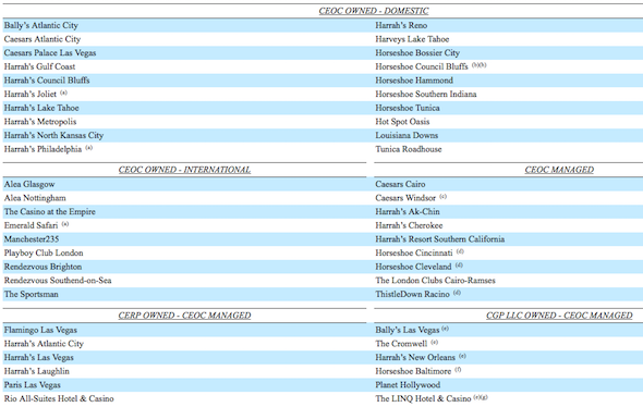 What was left in Caesars Entertainment Operating company, the unit that filed for bankruptcy Thursday, were assets like Harrah's resorts in Reno, Philadelphia, and Council Bluffs, Iowa. The only desirable asset still under CEOC is Caesars Palace Las Vegas. The full list of properties as of Sept. 30, 2014 is below.