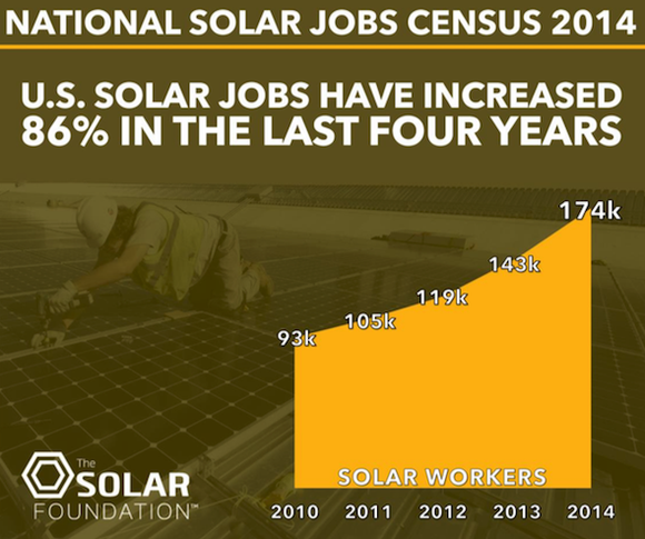 The Solar Foundation's National Solar Jobs Census 2014 was released last week, and it showed that solar industry jobs grew 21.8% from a year ago in November to 173,807 -- it's a relatively small base, but it's 20 times faster than the national average growth rate of 1.1%. Over the next year, another 36,289 employees are expected to be added.