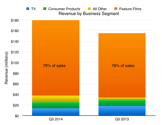 The problem is that the company's other major business lines -- consumer products and television -- haven't stepped up their production. Last quarter, feature film revenue accounted for the same huge proportion of sales as it did a year ago, almost 80%.