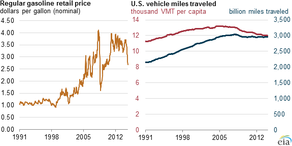 As that chart shows, higher gas prices over the past few years have had a bit of an impact on how much we're driving each year as the average miles traveled per person is about 1,000 miles off of its peak of a decade ago. However, gasoline prices aren't the only thing impacting this trend as demographic shifts have caused many Americans to stop driving as much as they had in the past. Meanwhile, a rise in telecommuting has many Americans disappearing from the daily commute. That said, those who drive more miles obviously spent more money than average at the pump.