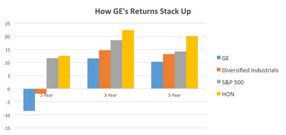 But whether we look at returns over a one-year, three-year, or five-year time frame, GE's consistently underperformed close competitors like Honeywell, its industrial peers, and the broader market, as shown in the chart below: