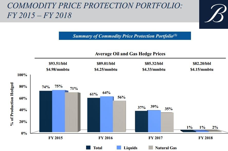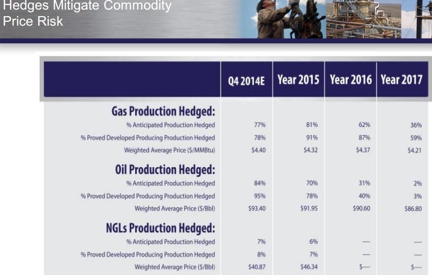 Meanwhile, Linn's hedge portfolio covers 90% to 100% of its natural gas production through 2016 with this year's oil hedged up to 70%, and 60% going into 2016.