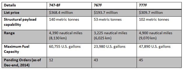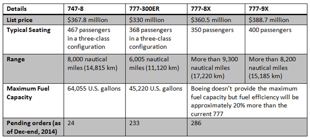 On the technology side, with fuel-efficient twin-engine planes available in the market, flying the four-engine fuel-guzzling jumbo jet doesn't make much sense anymore. This is true for both passenger and freighter planes. The chart below provides a snapshot of how the 747-8 passenger version fares against Boeing's popular 777 wide-body plane and the 777X, which will enter service toward the end of the decade.