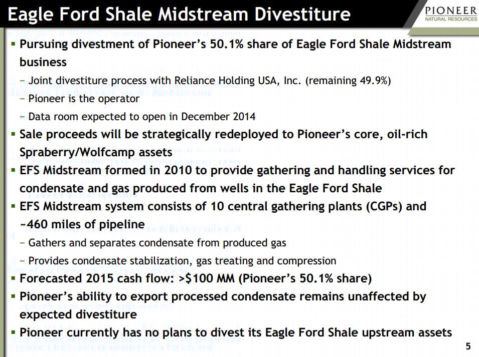 Pioneer Natural Resources owns 50.1% of its Eagle Ford Shale midstream business with Indian partner Reliance Holding USA owning the other half. As the following slide notes, the business was formed in 2010 to gather and handle condensate and natural gas produced from the Eagle Ford Shale.