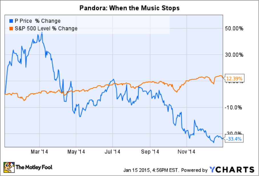 Tim Beyers (Pandora Media): For audio streamer Pandora Media (P +0.00%), 2014 was the year the music stopped. The stock fell more than 33% last year versus a better-than-12% gain for the S&P 500. Why should anyone buy into a growth story that's failed to deliver for shareholders?