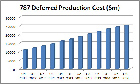 On the third quarter conference call, Boeing CFO Greg Smith said the company increased its deferred production cost on the 787 in Q3 by "$947 million to $25.2 billion, largely driven by the increase of 787-9 production and the continued inventory pull ahead."