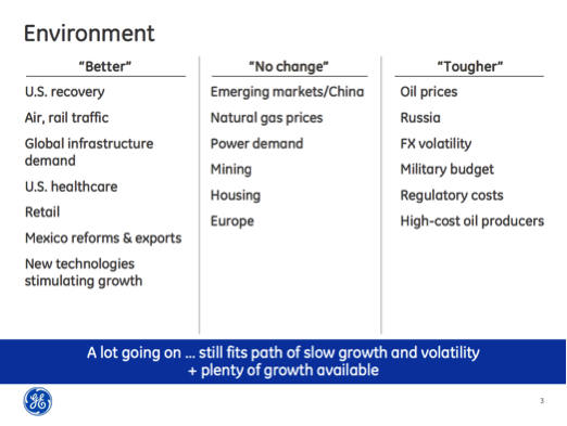 The big buzzwords are oil, the U.S. economy, and China. Yes, there are plenty of other variables at play, but these will be the challenging ones to predict as we peer into the future. GE also laid out a dozen or so additional factors that will play into top-line growth in 2015 in the following slide: