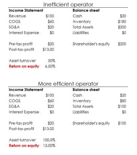 The lemonade stands have asset turnover ratios of 0.5 and 1.0, respectively. Not surprisingly, the second company also has a higher return on equity of 13%, compared to 6.5% for its less efficient rival.