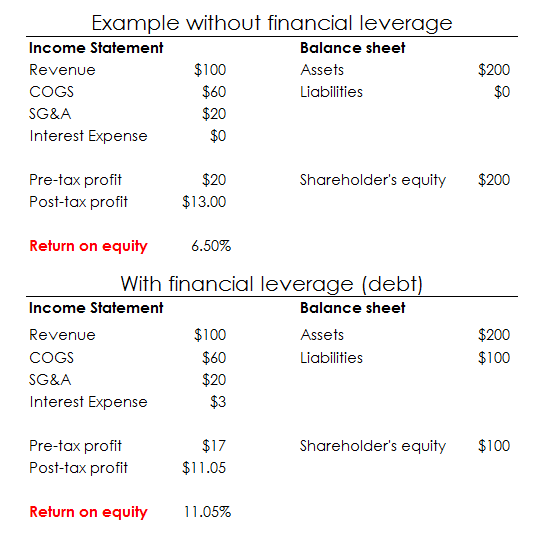 However, despite greater total profits, the first company has a lower return on equity of 6.5% compared to 11.05% for the second company. This is due to the fact that the second company has shareholder's equity of only $100 compared to $200. Thus, when you divide net income by shareholder's equity, you see that the second company has a higher ROE due to its financial leverage.
