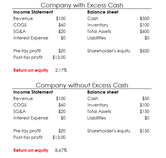 The only difference in this example is how much idle cash is sitting on the balance sheet. When cash piles up on a company's balance sheet, it can drag down a company's return on equity. This is why it's very important to consider a company's financial leverage when analyzing a company's return on equity.