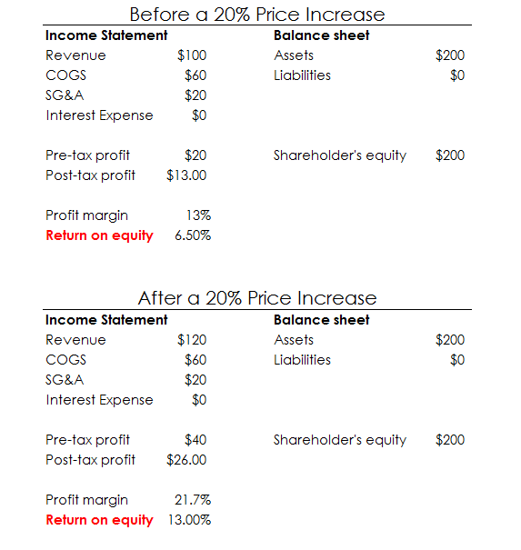 The net result is that after increasing prices, which increases profits, the company earns a higher return on equity after raising prices (13%) than it did before the price increase (6.5%).