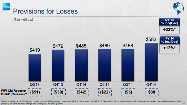 American Express gives a good view of its recent provisioning in its earnings supplement. The company provisioned for greater loan losses than in prior periods, but only after several quarters of reserve releases. What was a benefit in prior quarters (letting reserves come down on an absolute basis) has turned into a negative (reserves are going back up).