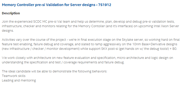 The question, I think, will boil down to product readiness. To that end, I did some sleuthing. Intel is hiring fairly aggressively for its server division, and I stumbled across a job listing that hints as to the state of development of Skylake-EP: