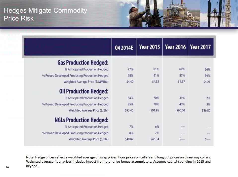The main reason the company's distribution is at risk and its balance sheet is weakening is that the company's oil and gas cash flows are going to be falling over the next year due to the surprising plunge in oil prices. Vanguard Natural Resources does hedge a large portion of its oil and gas production to mute this impact, which we can see on the slide below.