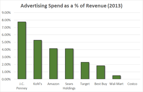 Wal-Mart is actually one of the world's largest advertisers, spending a whopping $2.4 billion on advertising in 2013. But as a percentage of its revenue, Wal-Mart spends far less than nearly every other major retailer: